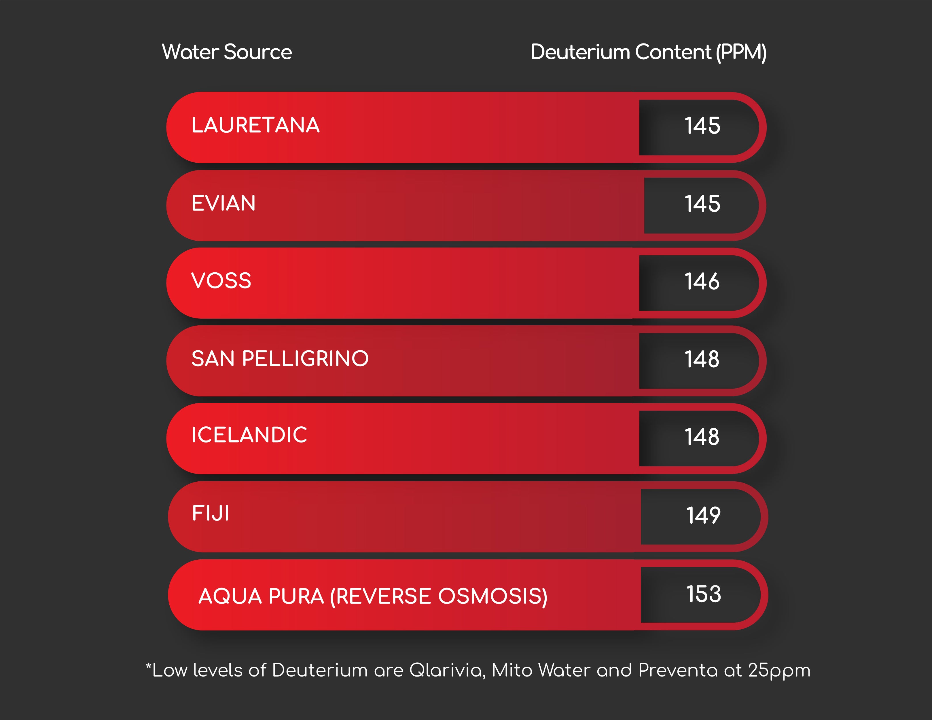 Water is the quickest and most sure fire way to get rid of deuterium and replace it with hydrogen. The best waters for low levels of Deuterium are Qlarivia, Mito Water and Preventa. However these products cost around $20 per litre of water, an expensive way to lower D levels! These products are typical at D levels of 25ppm and are the lowest available
